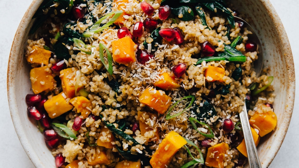 Σαλάτα με κολοκύθα στον ατμό , ρύζι και σπανάκι