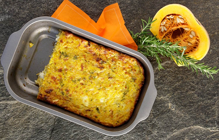 Ζεσταίνουμε 1 κουταλιά από το λάδι σε ένα μεγάλο τηγάνι (προτιμότερο αντικολλητικό) σε μέτρια προς δυνατή φωτιά και ρίχνουμε τα κρεμμύδια. Αλατοπιπερώνουμε και σοτάρουμε για 5 – 6 λεπτά, να γυαλίσουν. Χαμηλώνουμε λίγο τη φωτιά και συνεχίζουμε το σοτάρισμα για άλλα 5 λεπτά, ανακατεύοντας και προσθέτοντας, αν χρειάζεται, 1 – 2 κουταλιές νερό. Ρίχνουμε την κολοκύθα και άλλη 1 κουταλιά λάδι και σοτάρουμε για περίπου 10 λεπτά.